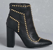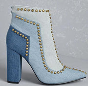 Colorblock Denim Bronze Pointed Toe Chunky Heel Booties